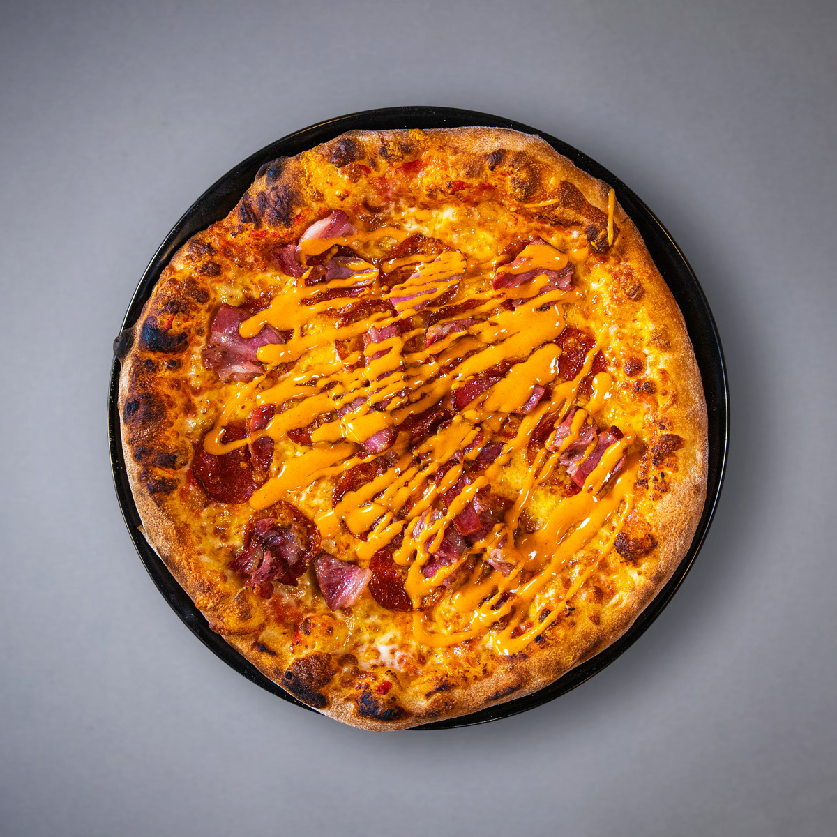 Knuspriger Boden, zarte Hähnchenbruststreifen, cremige Sauce Hollandaise und milde Peperoni....